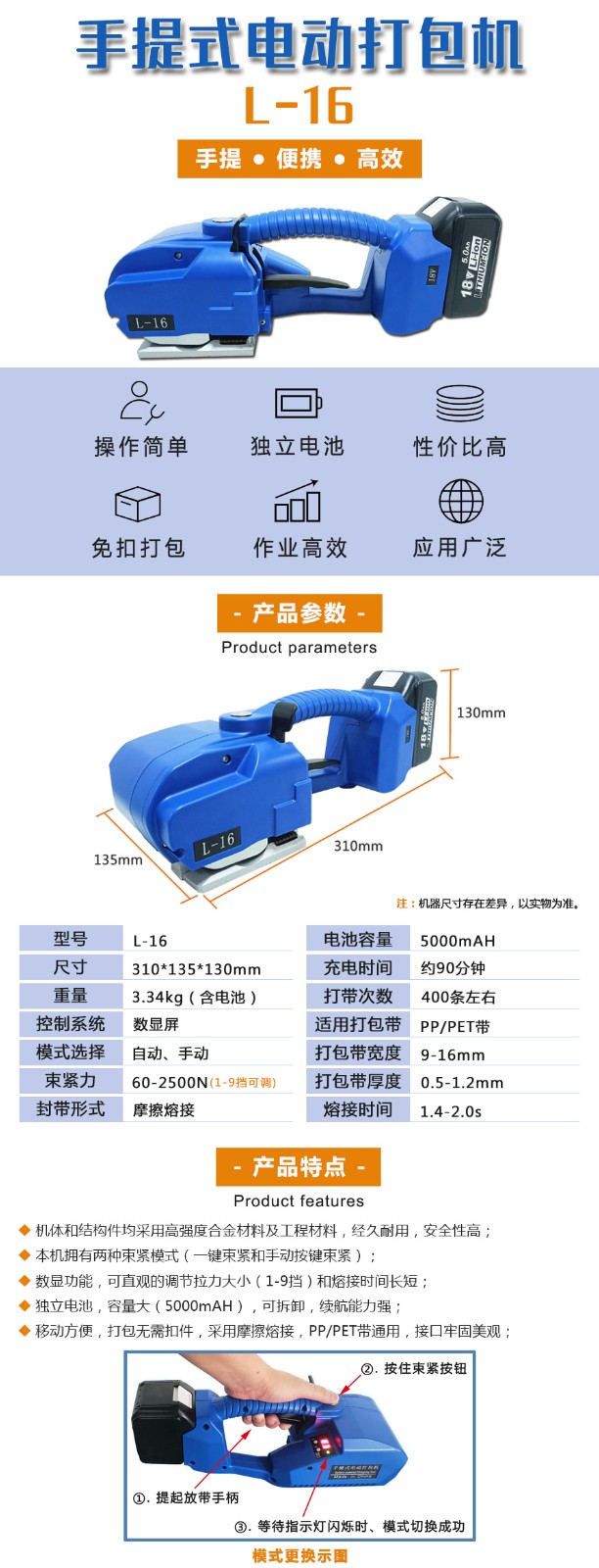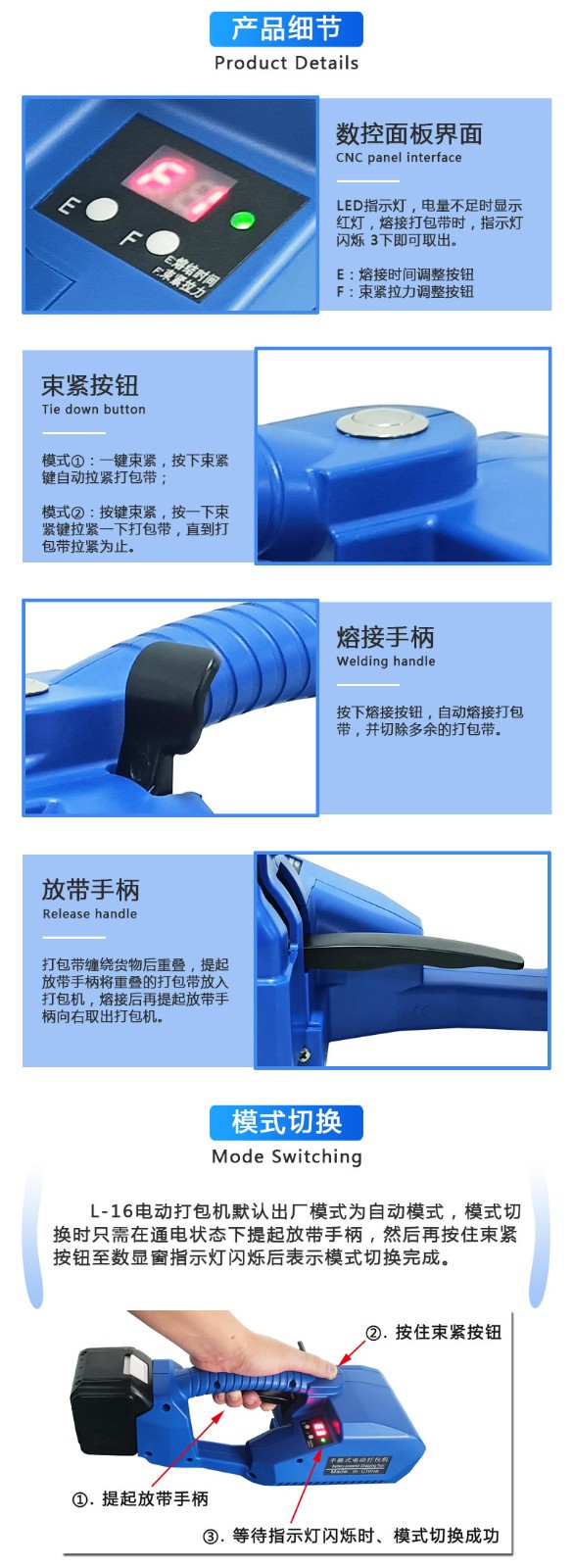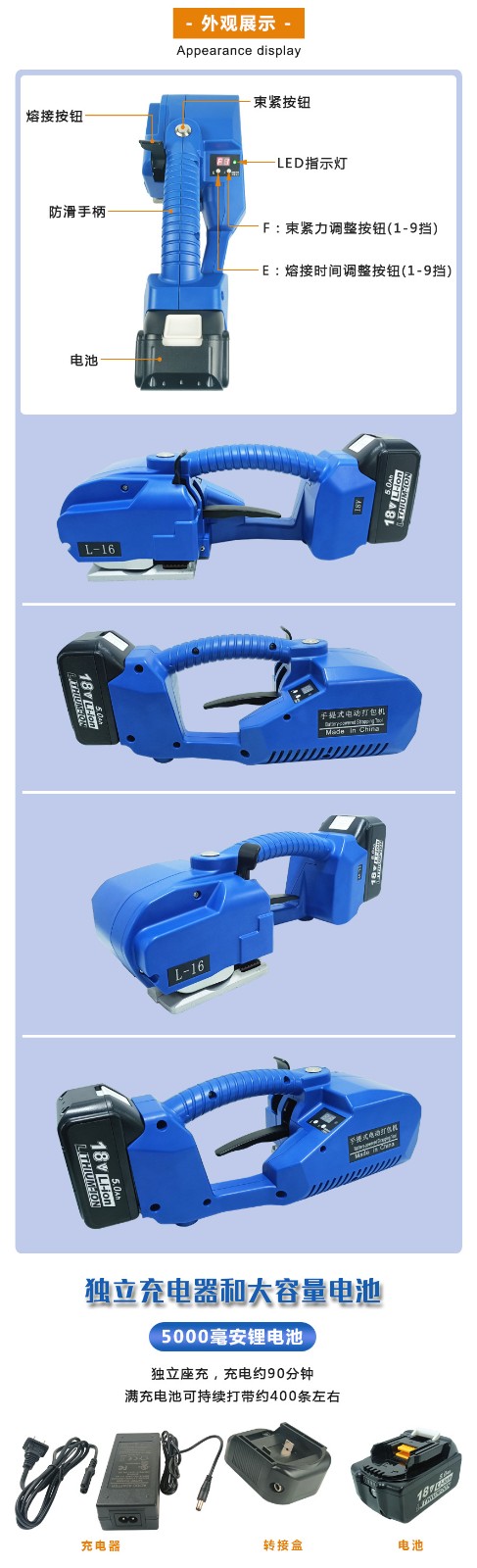 - 電動手持打包機的操作按鈕設計簡單直觀,操作人員可以方便地控制打包機的各個功能階段,如單獨的收緊、熔接和切斷操作,或者設置連續的打包流程,實現自動化程度較高的打包過程。