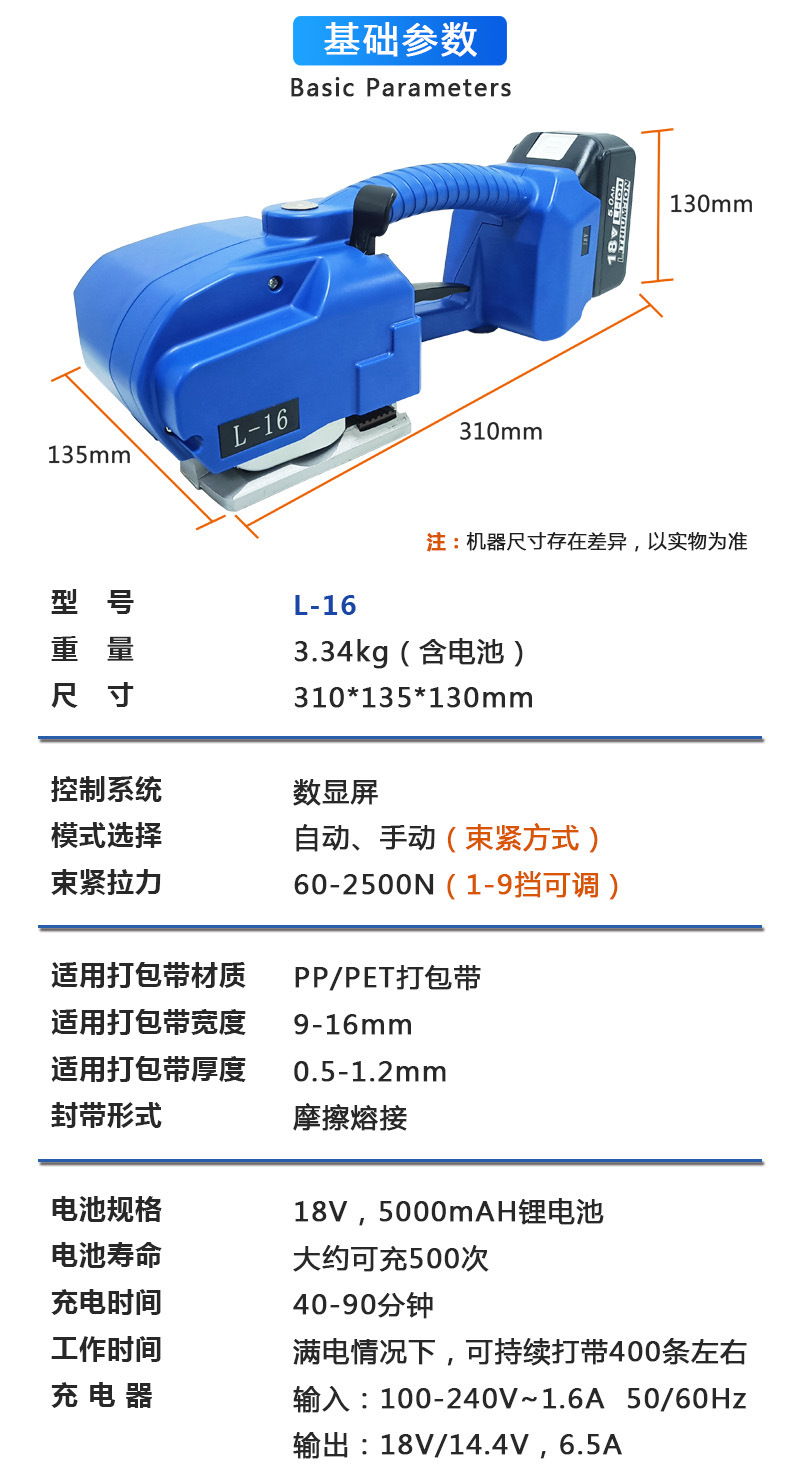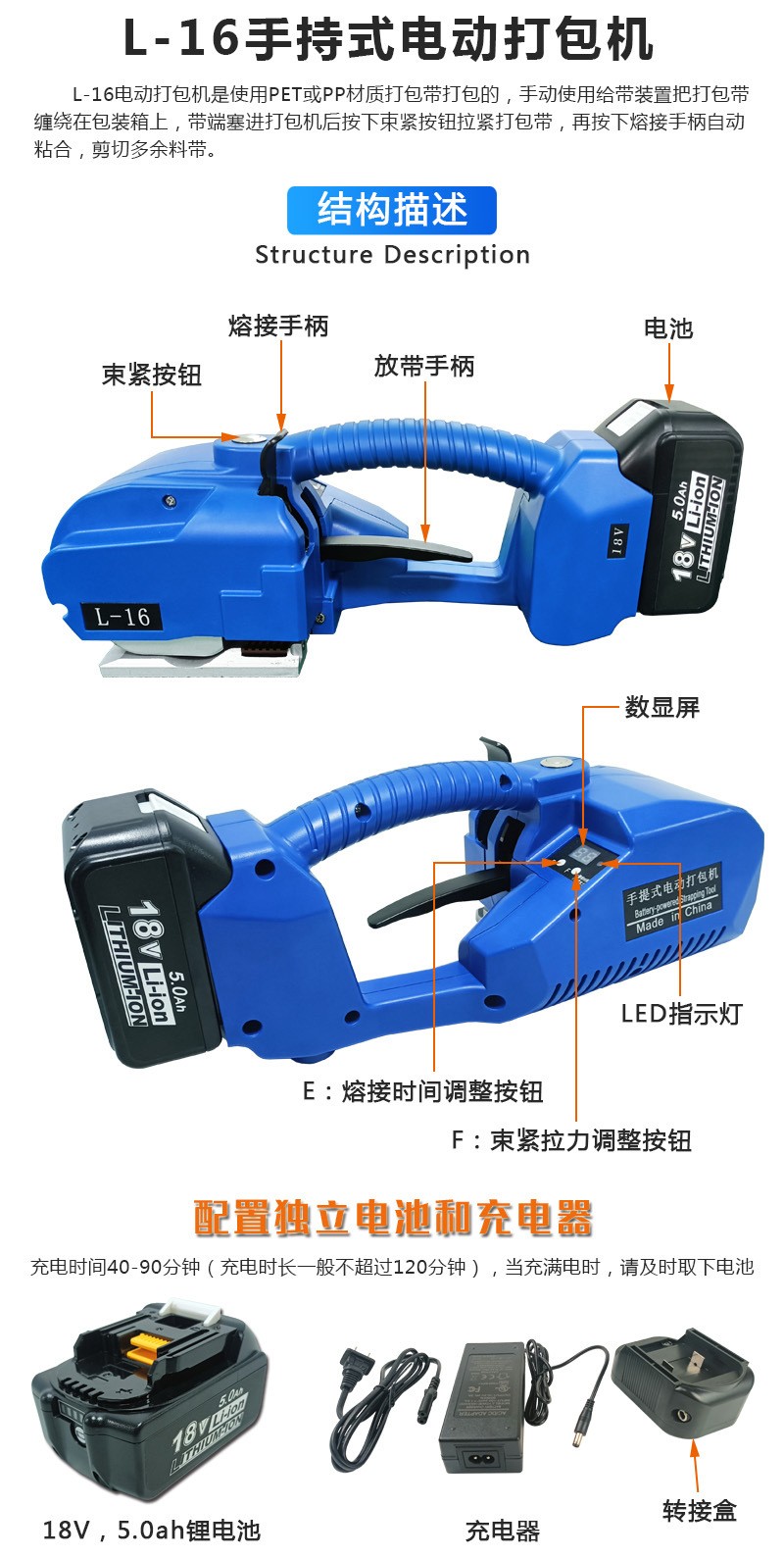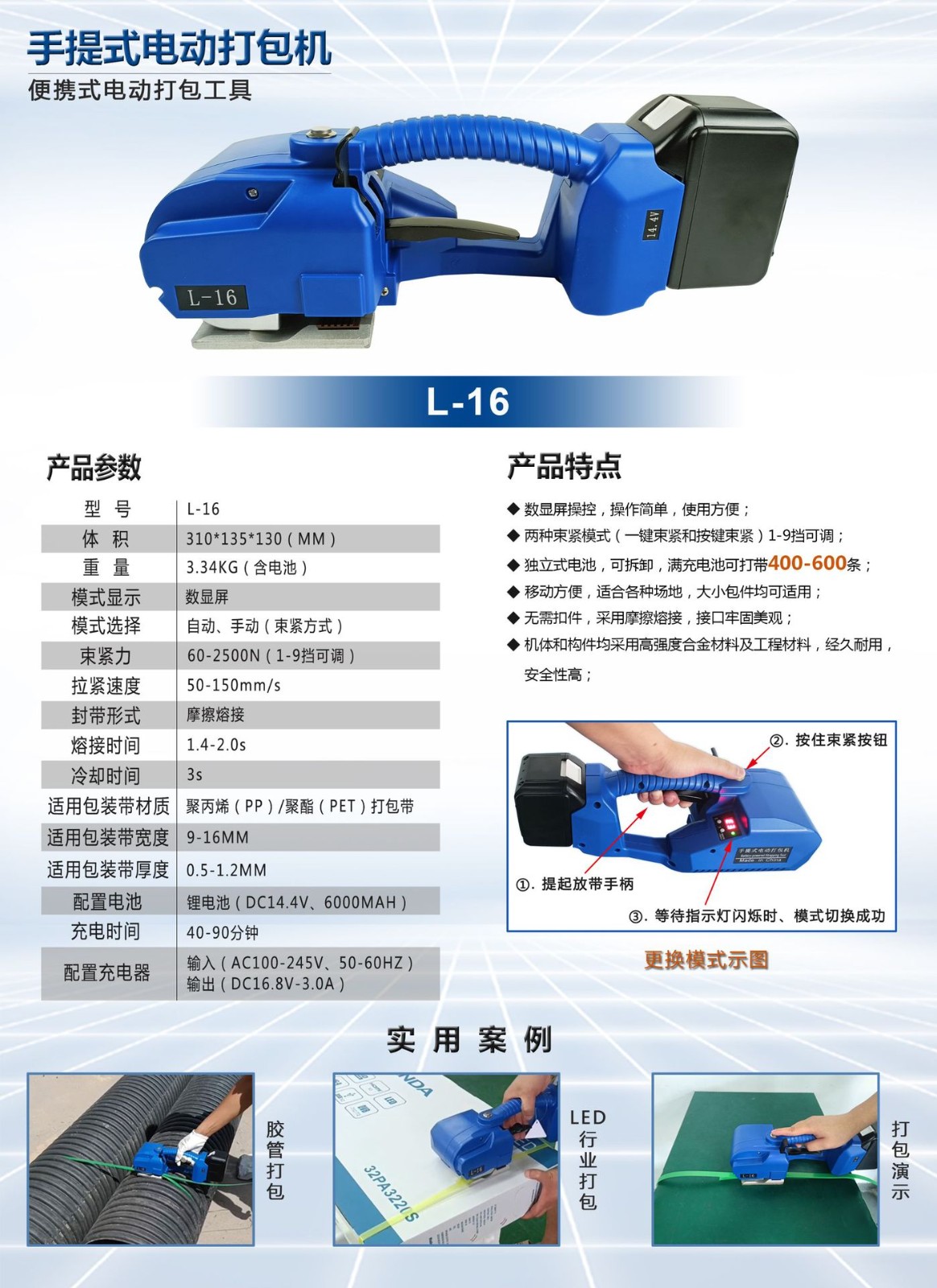 - 電動手持打包機的操作按鈕設計簡單直觀,操作人員可以方便地控制打包機的各個功能階段,如單獨的收緊、熔接和切斷操作,或者設置連續的打包流程,實現自動化程度較高的打包過程。