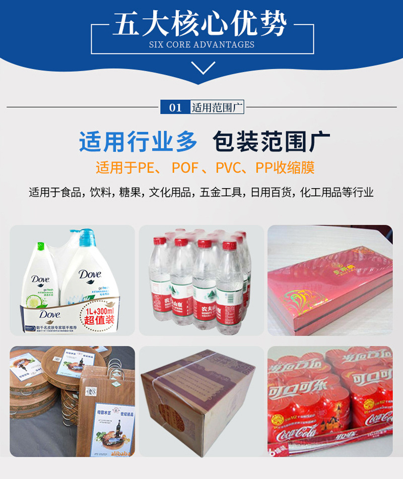 • 兼容多種包裝膜:可使用多種類型的熱收縮膜,如 PVC、POF、PE 等,企業可根據產品特性、包裝成本和市場需求選擇合適的膜材。