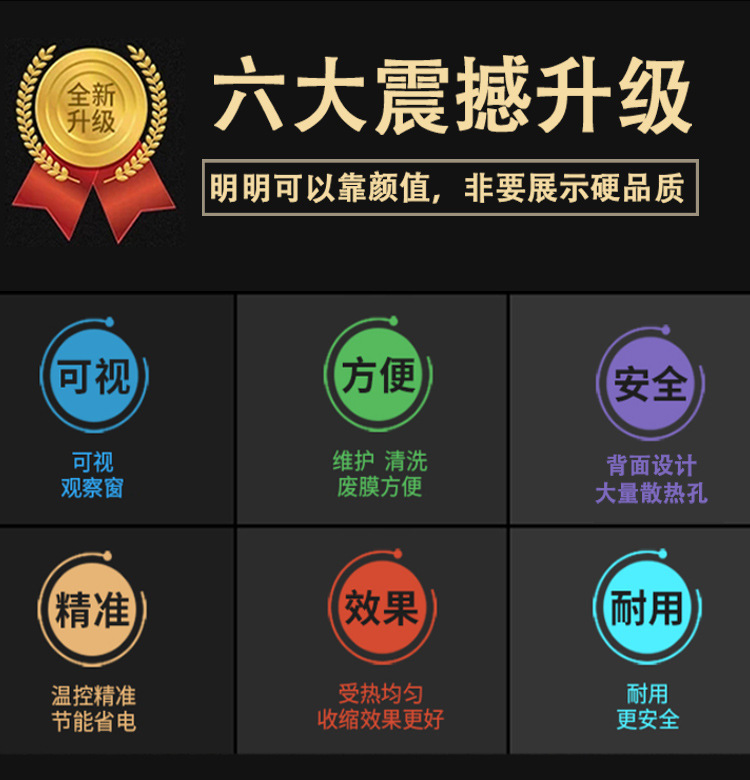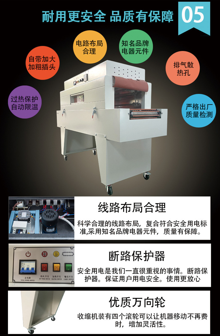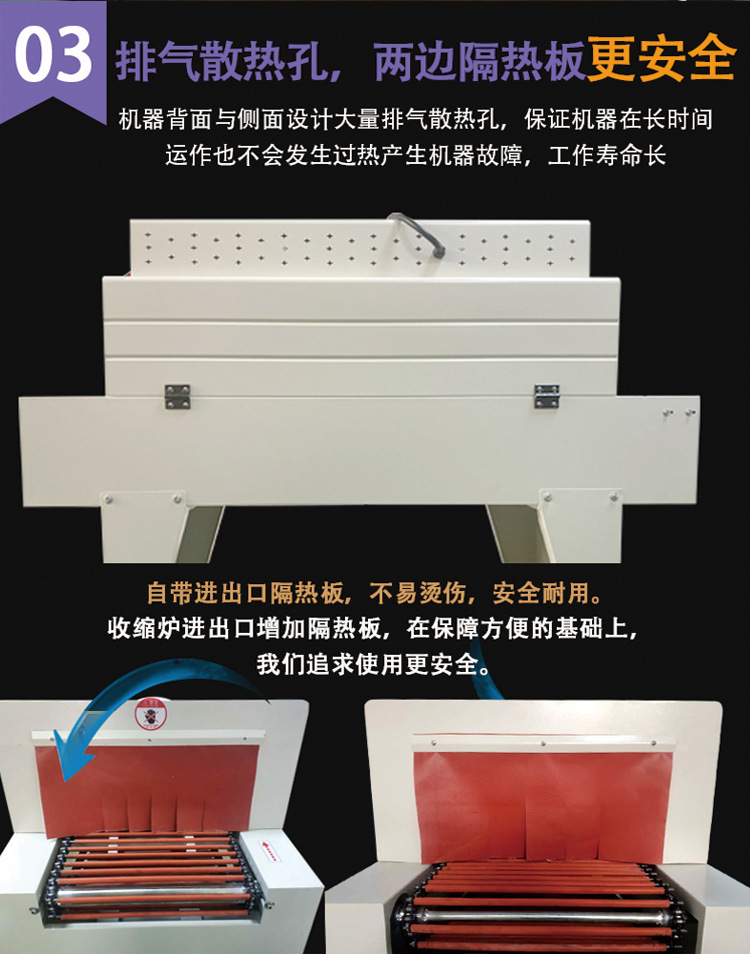 • 溫度控制系統的精度很重要,一般能夠精確控制在 ±5℃左右,這確保了薄膜在合適的溫度范圍內收縮,避免因溫度過高導致薄膜損壞或者溫度過低而收縮不完全的情況。