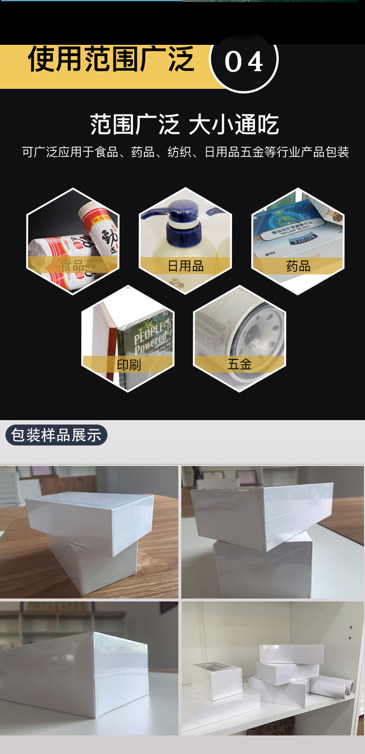 - 可以適應多種包裝薄膜材質,如 POF、PVC、PP 等熱收縮薄膜,并且能夠對不同形狀、大小和重量的產品進行包裝。無論是小型的電子配件、食品,還是大型的玩具、五金工具等,都可以使用全自動封切機進行高效包裝。