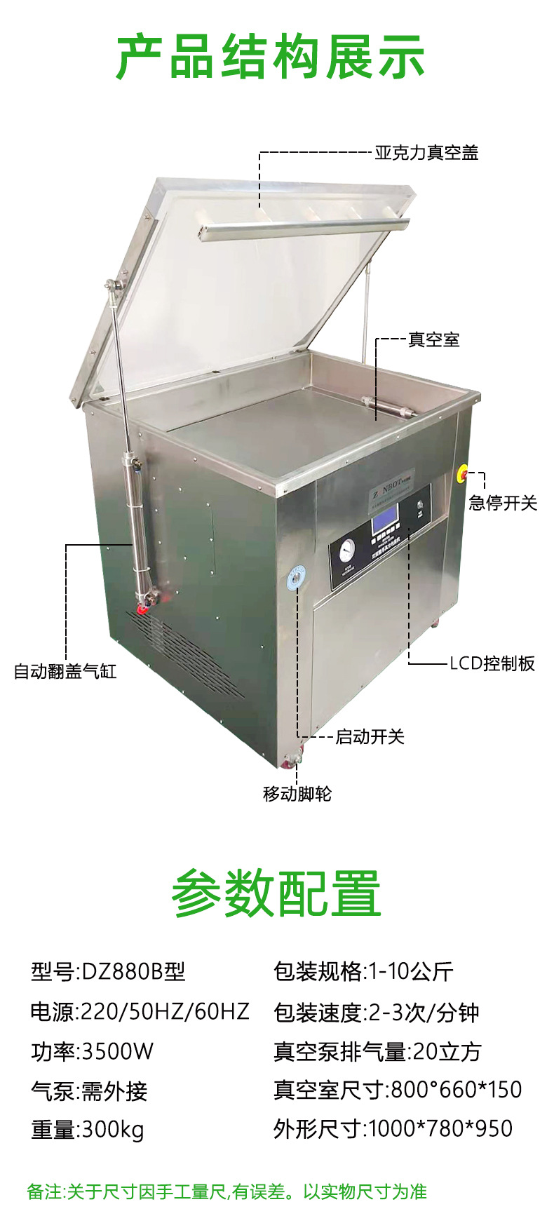 - 內(nèi)置真空泵是其核心部件,它的性能直接決定了抽真空的效率。通常,這種真空泵具有較高的抽氣速率和良好的真空度,能夠在短時間內(nèi)將工作腔內(nèi)的空氣抽出,達到理想的真空包裝效果。工作腔的設(shè)計也十分關(guān)鍵,它的大小和形狀要適應(yīng)不同尺寸的產(chǎn)品和包裝袋。