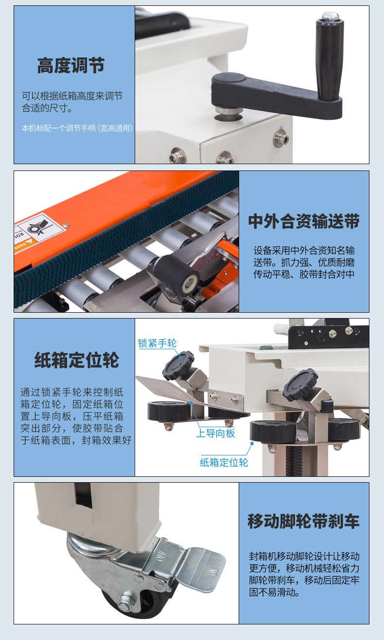 - 有膠帶支架、膠帶切割裝置和膠帶粘貼裝置等部分。膠帶支架用于放置膠帶卷,膠帶切割裝置能夠準確地將膠帶切斷,避免膠帶過長或過短影響封箱效果。膠帶粘貼裝置則通過壓力滾輪等結構將膠帶粘貼在紙箱上,并且可以調整粘貼的壓力,適應不同厚度的紙箱。