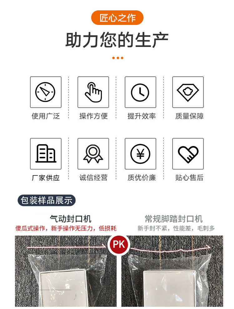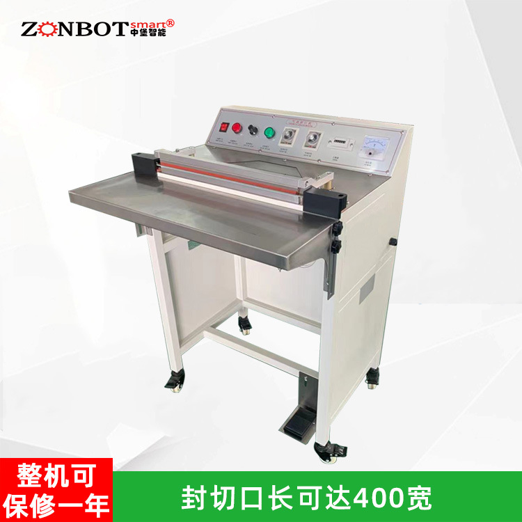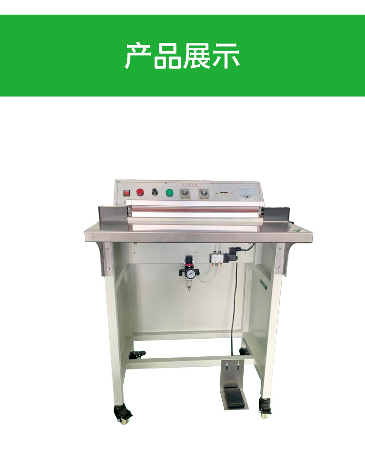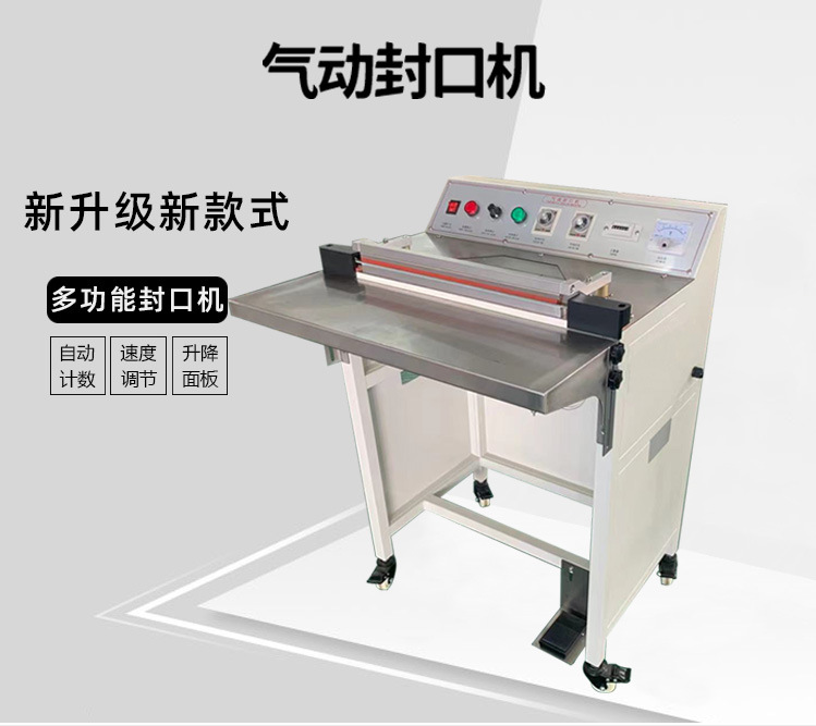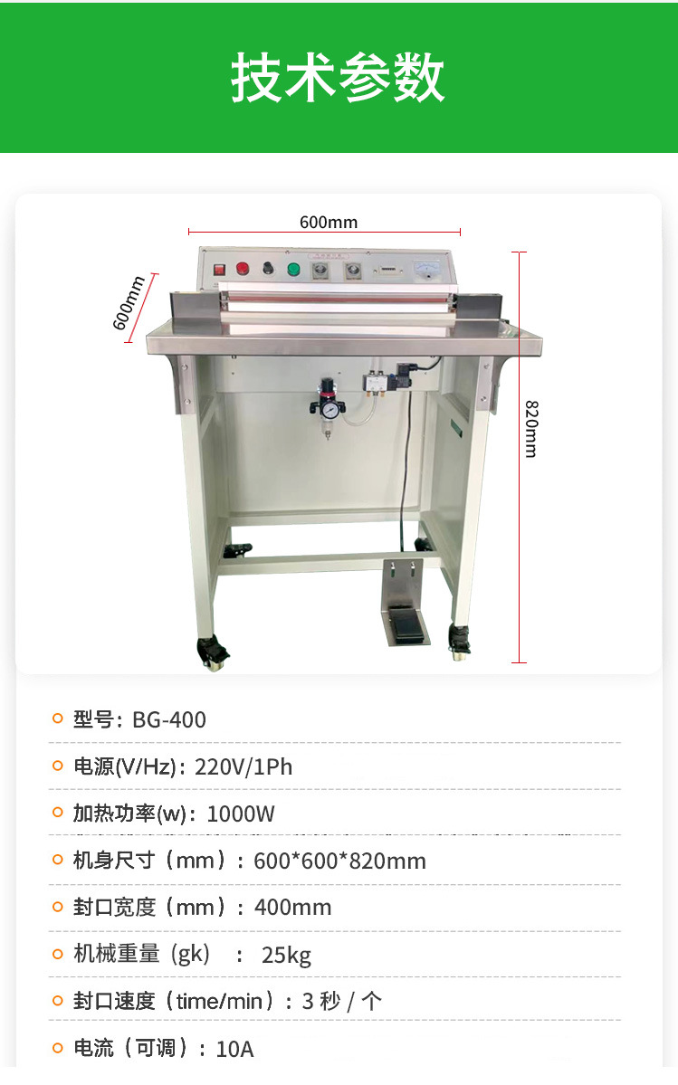以常見的腳踏封口機為例,封口長度可達 450mm,封口寬度為 5MM,脈沖功率為 1.4KW,外形尺寸為 500×400×900mm 。