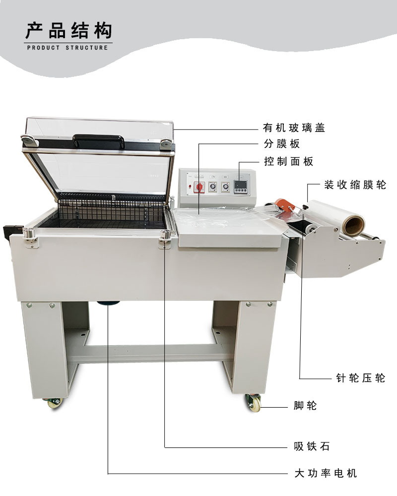 • 適用性強:可依包裝物尺寸調整高低,適用多種規格產品,能使用 pvc、pof、pp 等收縮包裝材料 。