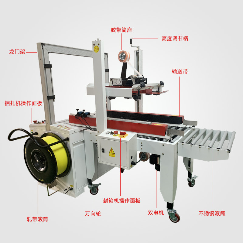 全自動封箱打包一體機,猶如一位不知疲倦且技藝精湛的包裝大師,在現(xiàn)代工業(yè)包裝領(lǐng)域展現(xiàn)出卓越的效能。其自動化連續(xù)作業(yè)模式,徹底革新了傳統(tǒng)包裝流程。設(shè)備啟動后,通過精密設(shè)計的輸送帶,平穩(wěn)且快速地將待包裝紙箱源源不斷地輸送至封箱工位。在封箱環(huán)節(jié),智能機械臂或高效皮帶裝置精準無誤地將紙箱上蓋與下蓋迅速折合,動作一氣呵成,緊接著膠帶粘貼裝置以極高的速度和精度,將膠帶整齊牢固地貼合在紙箱接縫處,完成完美封箱。封箱后的紙箱無縫銜接,即刻被輸送至打包工位。此時,打包機的穿帶機構(gòu)如同靈動的舞者,敏捷地將打包帶準確無誤地穿過紙箱預(yù)設(shè)的打包位置,隨后拉緊機構(gòu)瞬間發(fā)力,將打包帶緊緊束縛在紙箱上,最后通過熱熔或咬合機構(gòu),實現(xiàn)打包帶的穩(wěn)固連接,整個過程流暢自然。