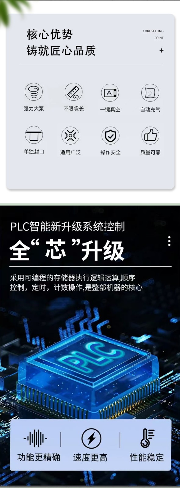 - 產(chǎn)品類型:不同的產(chǎn)品對(duì)包裝有不同的要求。如食品中的海鮮、水果、茶葉等,需要真空包裝以防止氧化變質(zhì)、延長(zhǎng)保質(zhì)期;電子產(chǎn)品則主要是為了防潮、防氧化變色。如果產(chǎn)品是液體或含有液體,要選擇具有防漏功能的包裝袋,并且機(jī)器的封口處需能確保密封4。對(duì)于形狀不規(guī)則或特大件的物品,外抽式真空包裝機(jī)更為適合,因其不受被包裝物尺寸的限制。
