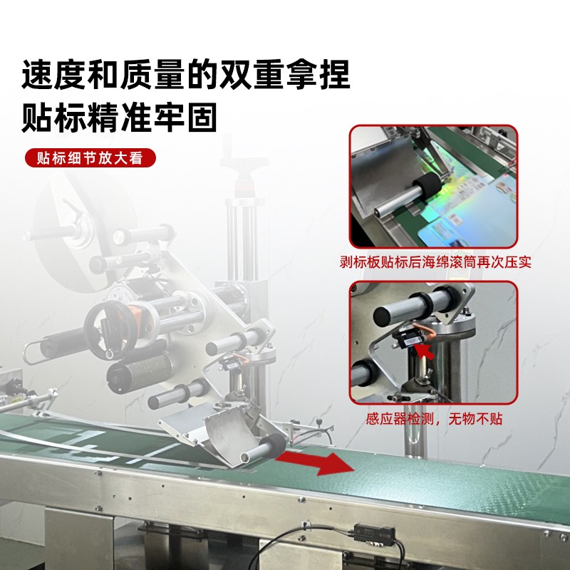 - 貼標(biāo)原理:當(dāng)產(chǎn)品到達(dá)貼標(biāo)位置時(shí),控制系統(tǒng)根據(jù)傳感器檢測(cè)到的信號(hào),觸發(fā)貼標(biāo)頭動(dòng)作。貼標(biāo)頭在機(jī)械臂或其他傳動(dòng)裝置的帶動(dòng)下,從剝離板處抓取標(biāo)簽,并以設(shè)定的速度和壓力將標(biāo)簽準(zhǔn)確地貼附在產(chǎn)品的指定位置上。貼標(biāo)完成后,貼標(biāo)頭返回初始位置,等待下一次貼標(biāo)指令。