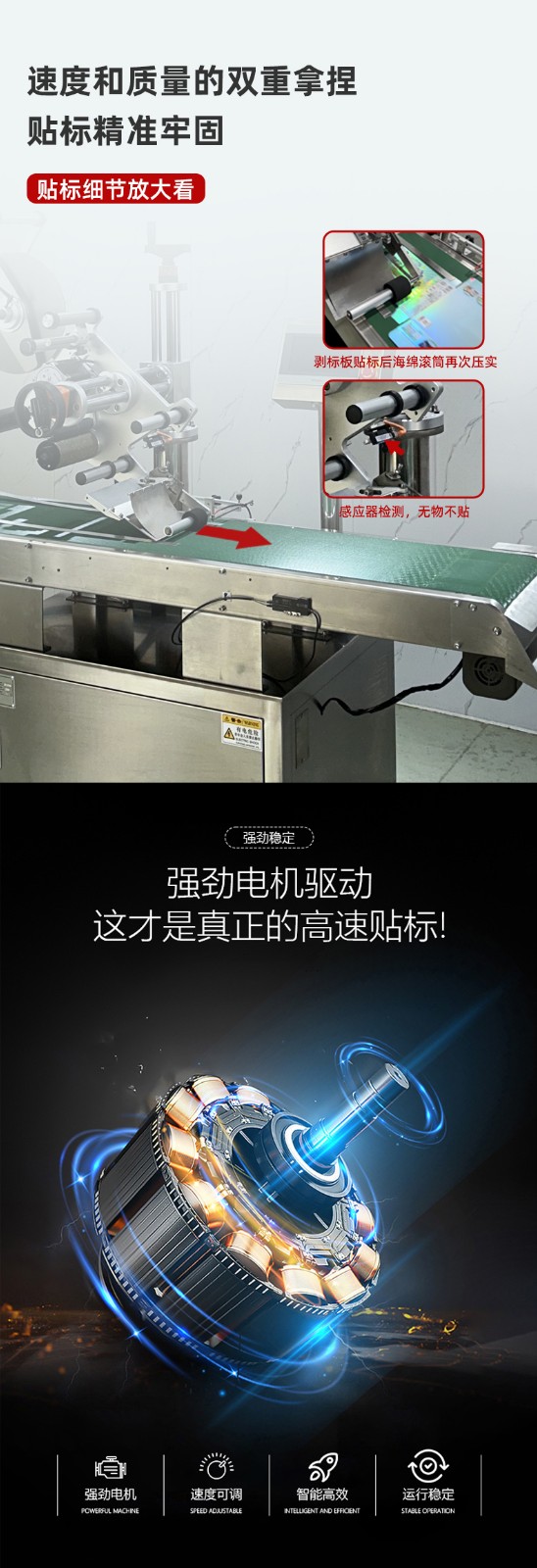 - 產(chǎn)品輸送原理:待貼標(biāo)的產(chǎn)品放置在輸送帶上,輸送帶由電機(jī)通過(guò)傳動(dòng)輥驅(qū)動(dòng)運(yùn)行。產(chǎn)品隨著輸送帶向前移動(dòng),在輸送過(guò)程中,產(chǎn)品定位裝置會(huì)對(duì)產(chǎn)品進(jìn)行定位,確保產(chǎn)品在貼標(biāo)位置保持固定的位置和姿態(tài),以便準(zhǔn)確貼標(biāo)。