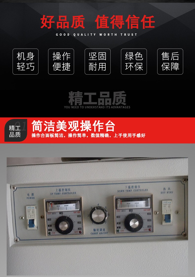 - 控制系統:是設備的 “大腦”,可以對加熱溫度、輸送速度、噴氣強度等參數進行設置和控制。操作人員可以通過控制面板方便地操作機器,并且控制系統還具備溫度監控和故障報警功能。例如,如果加熱溫度過高或過低,系統會發出警報并自動調整溫度;如果機器出現故障,如風機故障或輸送帶卡頓,也會及時提示操作人員進行維修。