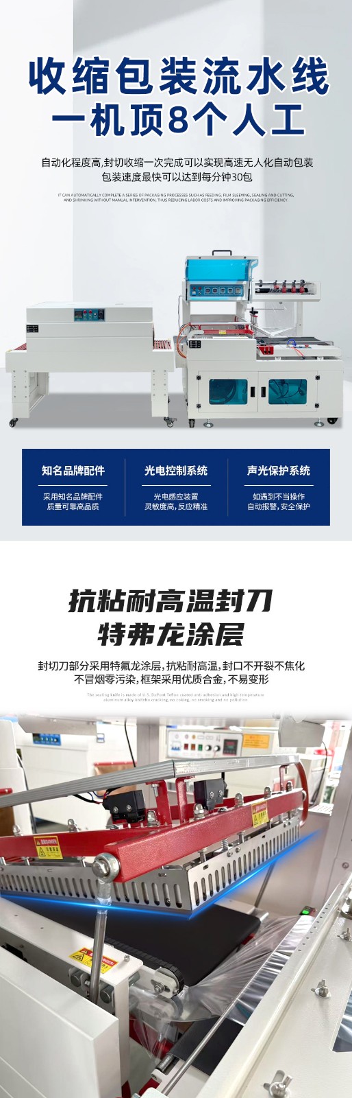 - L 型封切刀確保膜的封邊平整、無毛邊,熱收縮后膜與產(chǎn)品緊密貼合,無褶皺、無氣泡,不僅提升產(chǎn)品外觀檔次,還能實現(xiàn) “防水、防塵、防氧化”,延長產(chǎn)品保質(zhì)期(尤其適合食品、醫(yī)藥行業(yè))。