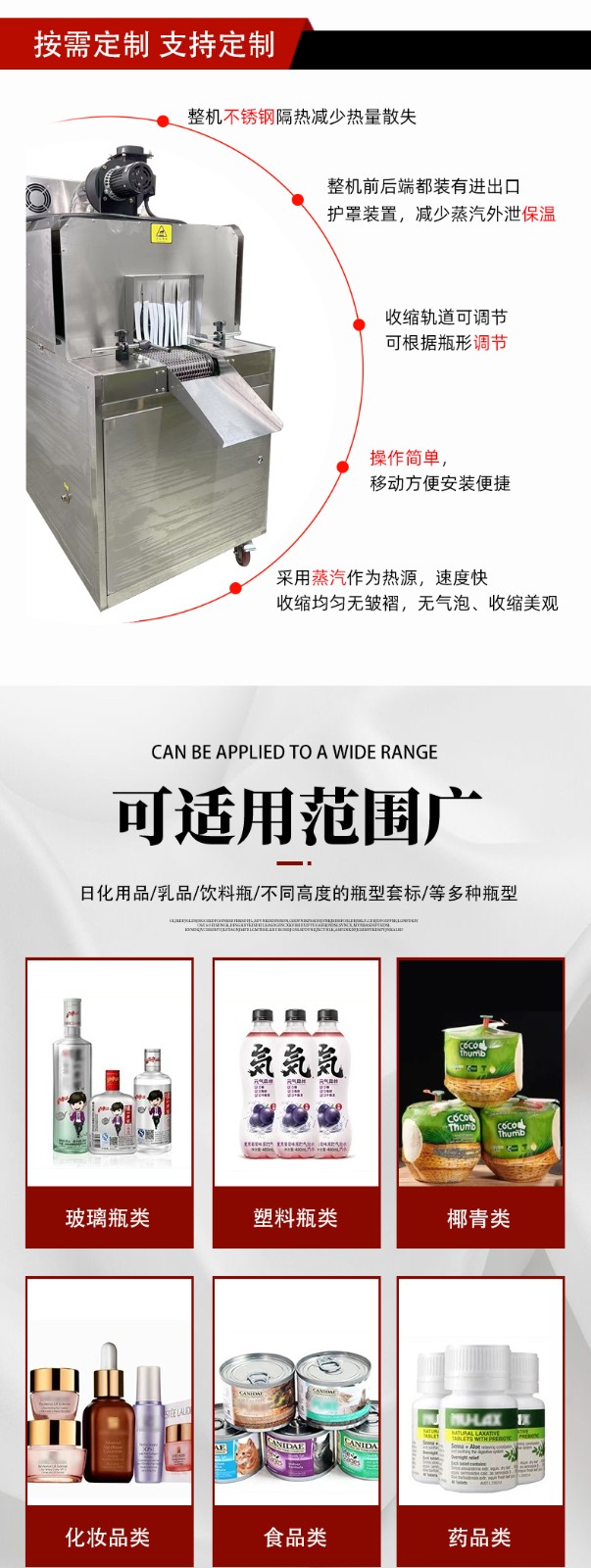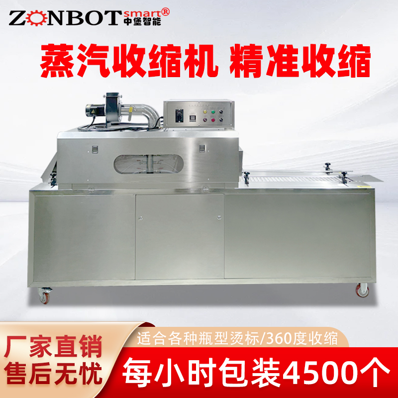 蒸汽的恒溫(通常溫度可控范圍 50-120℃)和擴散均勻性,能避免傳統(tǒng)熱風加熱導致的 “薄膜起皺、局部破裂” 問題,即使是異形產品(如不規(guī)則五金件、弧形瓶身),也能實現(xiàn)平整、無氣泡的收縮效果。 - 生產效率高:適配大規(guī)模量產需求