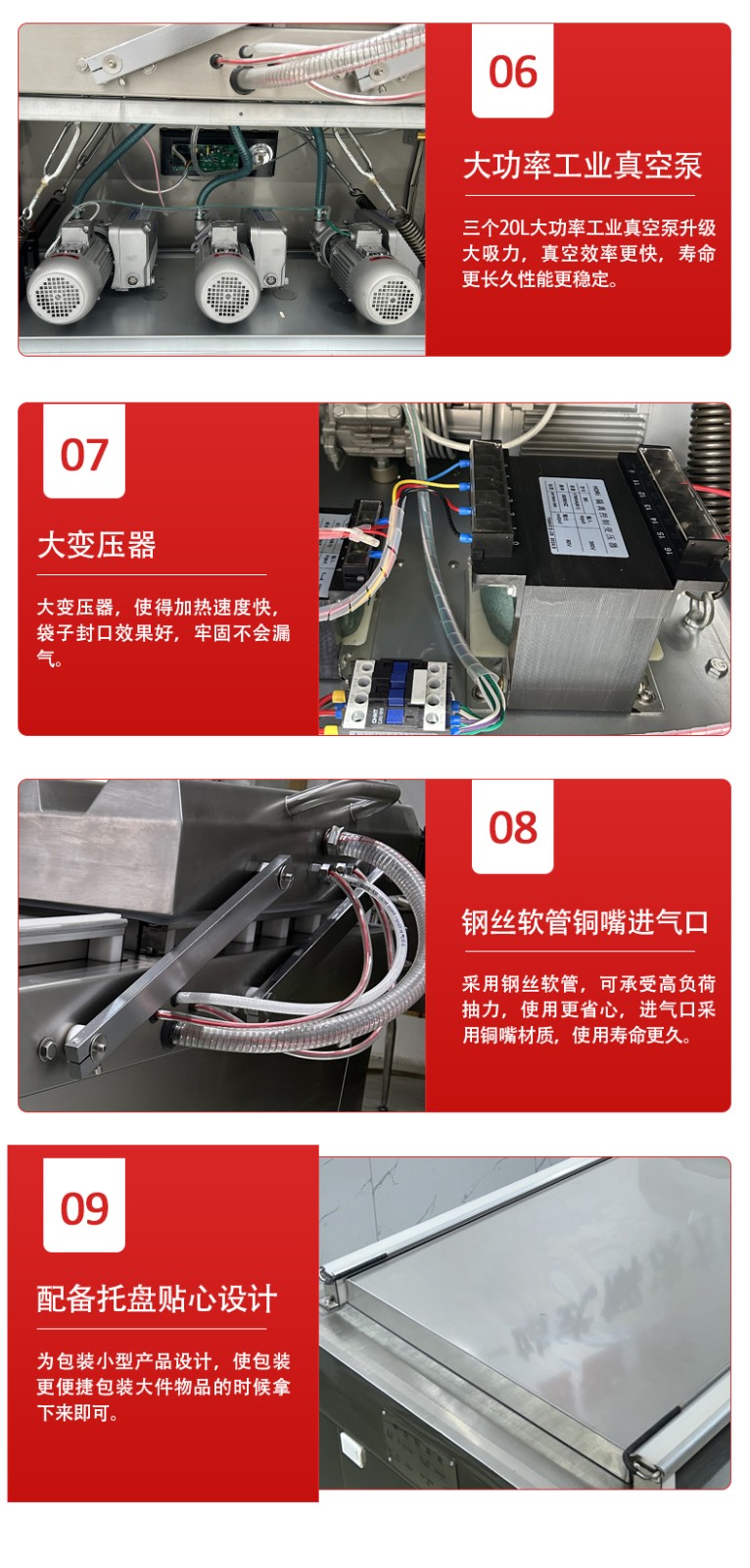 - 同一時(shí)間,右室真空蓋保持開啟,操作人員可同步將下一批待包裝產(chǎn)品放入右室包裝袋并擺好(即 “裝袋準(zhǔn)備”),無需等待左室流程結(jié)束 —— 此時(shí)左室 “忙” 于抽真空密封,右室 “閑” 于裝袋,兩者并行不沖突。